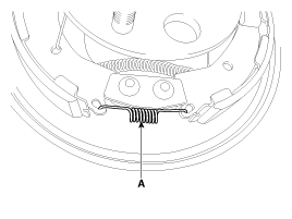 Закрепите трос стояночного тормоза (А) на тормозной колодке.