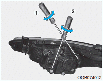 5. Направить ближний свет (и дальний свет) влево или вправо, поверните отвертку (2) по или против часовой стрелки. Чтобы направить ближний свет (и дальний свет) вверх или вниз вниз, поверните отвертку (1) по или против часовой стрелки.