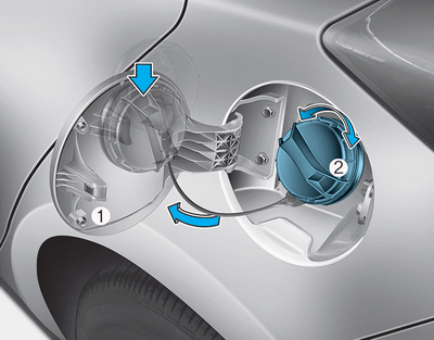 3. Потяните лючок топливного бака (1) на себя, чтобы полностью открыть его.