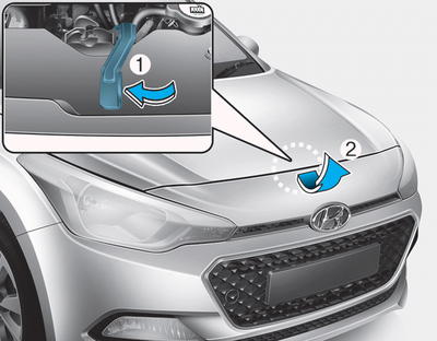 3. Подойдите к передней части автомобиля, слегка приподнимите капот, нажмите слегка приподнимите предохранительную защелку (1), расположенную в центре капота, затем поднимите крышка (2).
