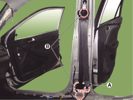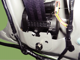 Подсоедините разъем преднатяжителя ремня безопасности (В).