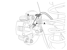 Установите трос стояночного тормоза (А), затем зажим (В).
