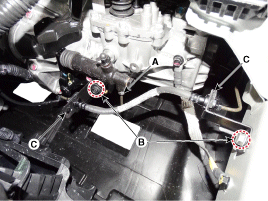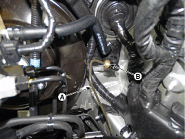 Отсоедините трубку сцепления (А) после снятия стопорного кольца (В).