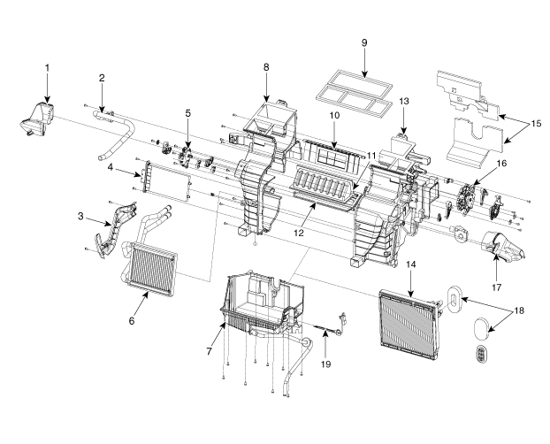 9. Прокладка воздуховода 10. Вентиляционная заслонка 11. Сборка передней двери 12. Температурный затвор в сборе 13. Корпус отопителя [D] 14. Блок активной зоны испарителя |