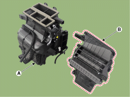 Снимите блок вентилятора и отопителя (А) с приборной панели (В).