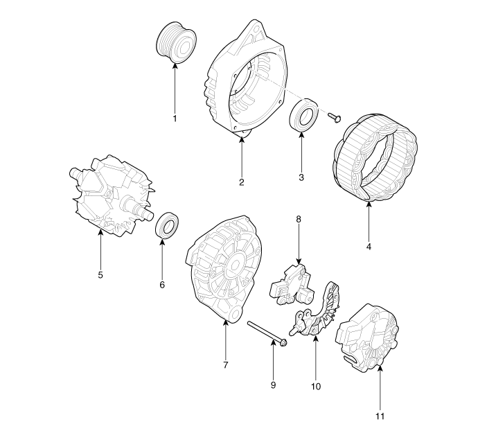 8. Сборка держателя щетки 9. Сквозной болт 10. Выпрямитель в сборе 11. Задняя крышка |