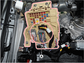 Отсоедините разъемы (A) со стороны предохранителей SJB (B).