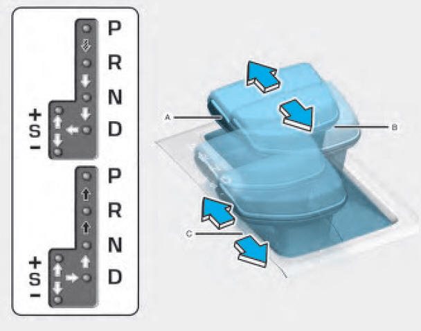 [A]: рычаг переключения передач, [B]: кнопка разблокировки переключения передач, [C]: ручной режим переключения передач