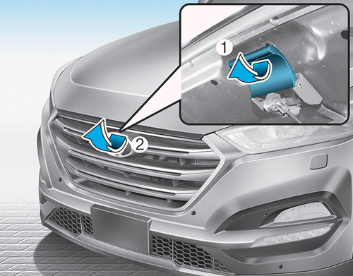 3. Подойдите к передней части автомобиля, слегка приподнимите капот, потяните защелку (1) в центре капота, затем полностью поднимите капот (2).