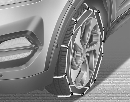 Кроме того, использование зимних шин предпочтительнее, чем использование цепей. Не устанавливайте отсутствие цепей на автомобилях с алюминиевыми дисками. Если вам нужно чтобы использовать их, выберите металлические цепи. Если вам нужно использовать строки, выберите каналы HYUNDAI и прочитайте инструкцию перед установкой.