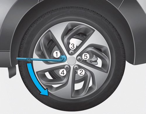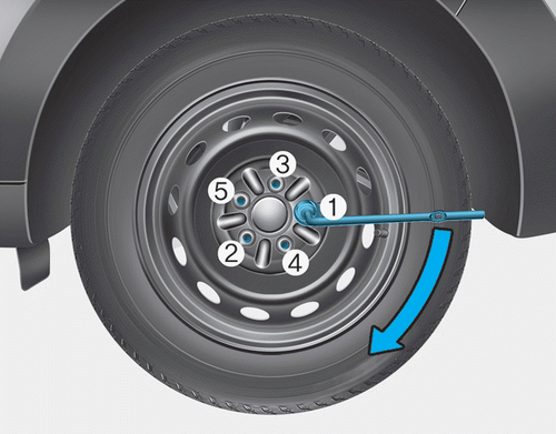 13. Затяните колесные гайки в указанном порядке с помощью колесного ключа. Дважды проверьте, чтобы гайки были затянуты. Когда вы меняете шину, мы рекомендуем вам иметь момент затяжки колесные гайки у авторизованного дилера HYUNDAI. Колесные гайки должны быть затянут до 9-11 кг.м (65~79 lb.ft).