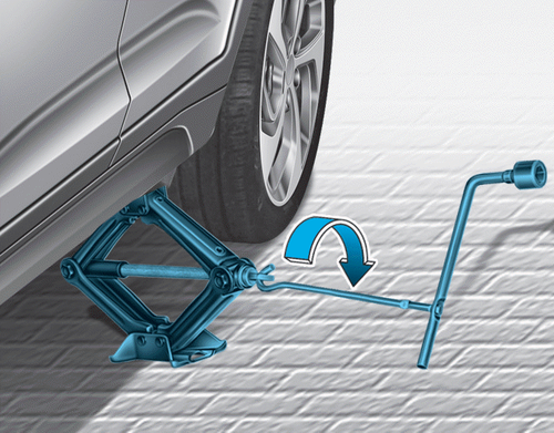8. Вставьте рукоятку в домкрат и поверните ее по часовой стрелке, пока колесо больше не касается земли. Убедитесь, что автомобиль устойчив на Джек.