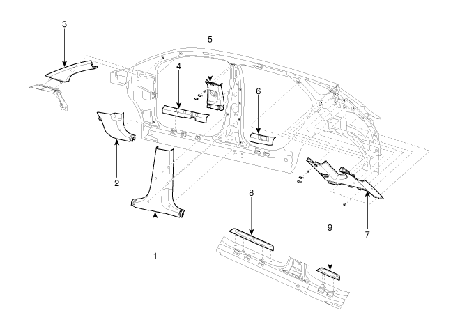 7. Орнамент задней стойки 8. Облицовка ступеней передних дверей 9. Облицовка подножки задней двери |
