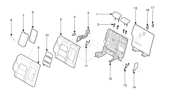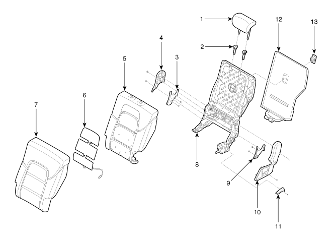 2. Направляющая подголовника заднего сиденья 3. Внутренняя защитная крышка внутренней подушки заднего сиденья. 4. Внутренний защитный чехол подушки заднего сиденья. 5. Обивка спинки заднего сиденья 6. Обогрев спинки заднего сиденья 7. Обивка спинки заднего сиденья |