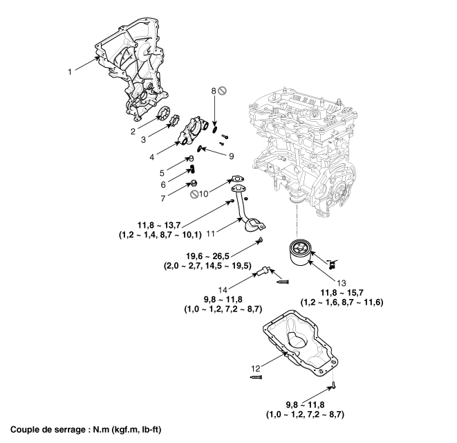 9. Уплотнительное кольцо (сторона нагнетания) 10. Прокладка масляного фильтра. 11. Масляный фильтр 12. Масляный поддон 13. Масляный фильтр 14. ОПС (датчик давления масла) |