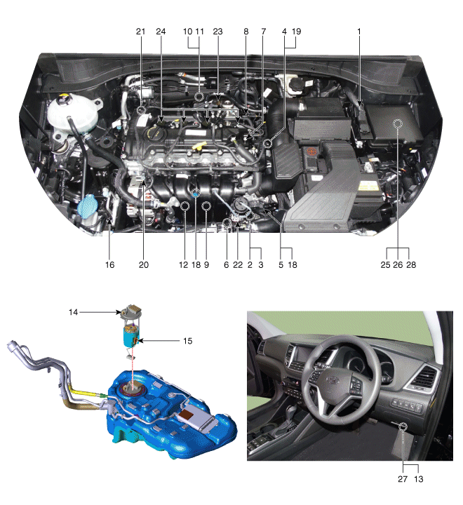 16. Датчик давления кондиционера (APT) 17. Двигатель ETC [встроен в модуль ETC] 18. Инжектор 19. Электромагнитный клапан управления продувкой (PCSV) 20. Масляный регулирующий клапан CVVT (OCV) [ряд 1/впуск] 21. Клапан управления потоком масла в системе CVVT (OCV) [ряд 1/выхлоп] 22. Электромагнитный клапан регулируемого впуска (VIS) 23. Клапан регулирования давления топлива (FPCV) 24. Катушка зажигания 25. Главное реле [блок EMS] 26. Реле топливного насоса [блок EMS] 27. Разъем канала передачи данных (DLC) [16 контактов] 28. Многофункциональный разъем управления (20 контактов) |