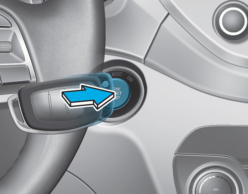 Если батарея смарт-ключа разряжена или смарт-ключ не работает правильно, вы можете запустить двигатель, нажав кнопку старт/стоп размещение смарт-ключа, как показано выше.