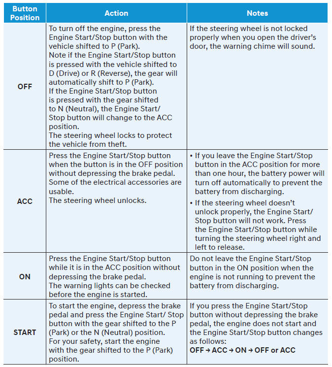 Чтобы выключить автомобиль в экстренной ситуации: Нажмите и удерживайте кнопку запуска/остановки двигателя кнопку более двух секунд ИЛИ Быстро нажмите и отпустите двигатель кнопку Старт/Стоп три раза (в течение три секунды).