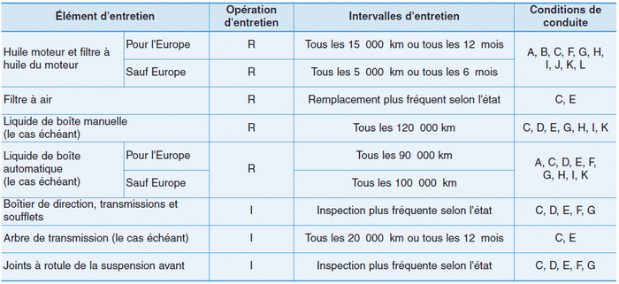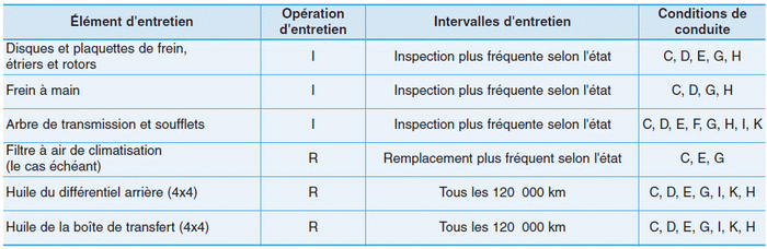 Следующие элементы следует обслуживать чаще на транспортных средствах используется в основном в экстремальных условиях. См. таблицу ниже для надлежащих интервалов обслуживания.