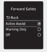 При включенном двигателе выберите или снимите флажок «Помощь водителю > Безопасность движения вперед». от меню настроек, чтобы указать, следует ли использовать каждая функция.