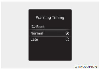 При включенном двигателе выберите «Помощь водителю > Время предупреждения» в Меню настроек для изменения начального время активации предупреждения для Forward Помощь в предотвращении столкновений.
