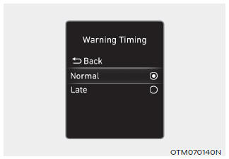 При включенном двигателе выберите «Помощь водителю > Время предупреждения» в Меню настроек для изменения начального время активации предупреждения для Forward Помощь в предотвращении столкновений. При первой доставке автомобиля Время предупреждения установлено на «Нормальное». Если вы изменить время предупреждения, предупреждение Время другой помощи водителю системы могут измениться.