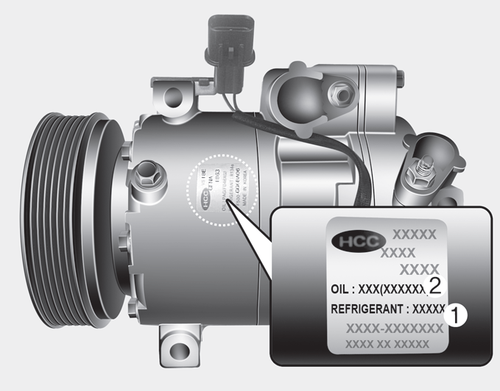 На табличке указан тип компрессора в вашем автомобиле, в частности модель, номер поставщика, заводской номер, хладагент (1) и охлаждающее масло (2).