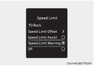 При включенном двигателе выберите или снимите 'Водитель Поддержка>Ограничение скорости' от меню настроек, чтобы указать, следует ли использовать каждая функция.