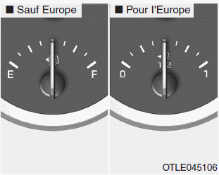 Недостаток топлива подвергает опасности пассажиров автомобиля. Вы должны немедленно остановиться и начать поиск топлива, как только загорится сигнальная лампа. горит или индикатор близок к 0 или уровню E (Пустой).