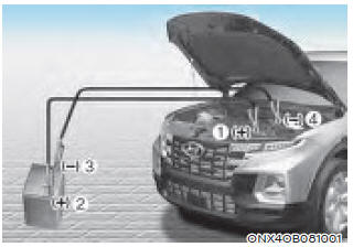2. Отсоедините другой конец соединительный кабель из черного, отрицательный (-) заземление батареи/шасси вспомогательное транспортное средство (3).