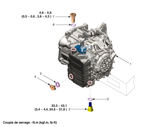 2. Прокладка сливной пробки 3. Сливная пробка 4. Пробка для проверки уровня ATF |