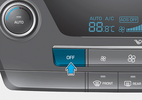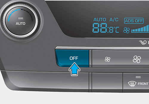 Нажмите кнопку OFF на передней панели, чтобы выключить кондиционер. Тем не менее, вы все еще можете управлять кнопками режима и воздухозаборника. пока зажигание находится в положении ON.