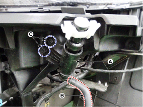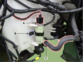 Подсоедините шланг омывателя и разъем двигателя омывателя.
