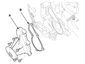 Снимите узел водяного насоса (А) с прокладкой (В).