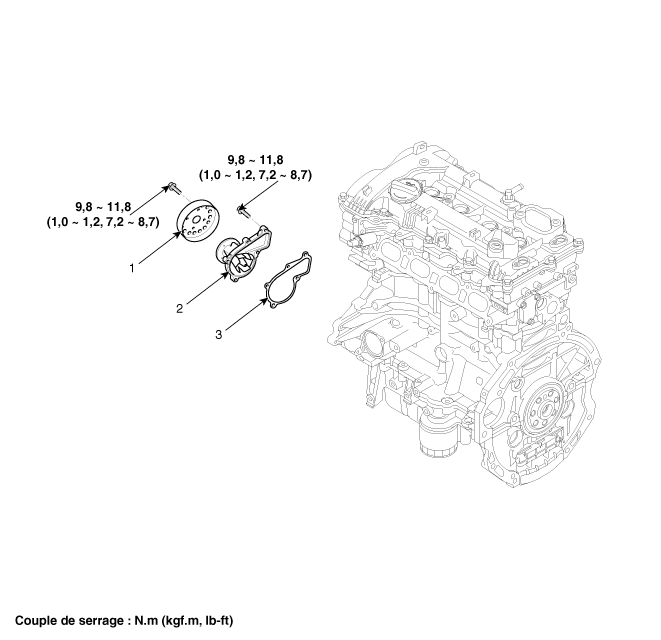 Проверьте наличие утечек охлаждающей жидкости. Если охлаждающая жидкость вытекает из отверстия, прокладка неисправна. Замените насос охлаждающей жидкости в сборе.