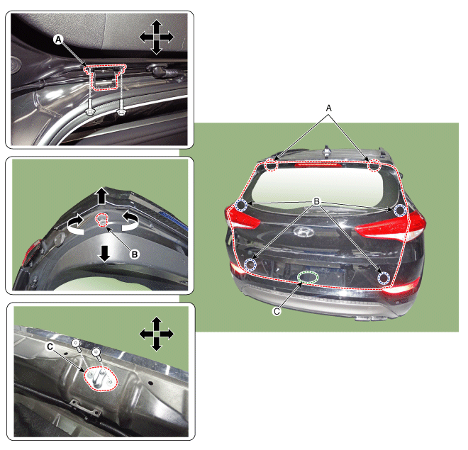 (A), отрегулируйте заднюю дверь, перемещая ее вверх и вниз или
