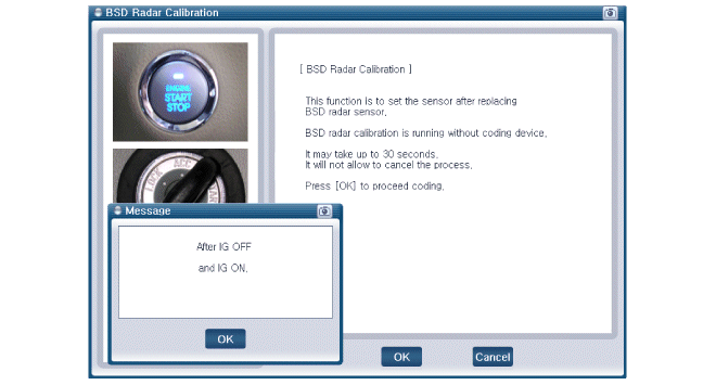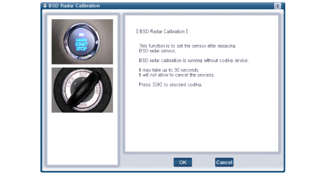 Зажигание «ВКЛ» и двигатель «ВЫКЛ», выберите систему и режим BSD.