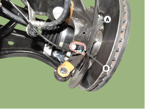 Снимите датчик скорости вращения колеса (В) с передней оси (А).