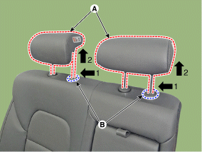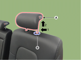 Нажмите на стопорный штифт (В) и снимите подголовник заднего сиденья.