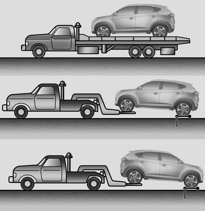 Если автомобиль буксирует частный эвакуатор, а не эвакуатор используется колесная опора, всегда следует поднимать переднюю часть автомобиля (но не заднюю). Автомобили 4x4 следует буксировать с поднятыми всеми четырьмя колесами и тележке или на бортовом прицепе с отрывом всех четырех колес от земли.