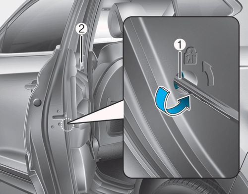 Блокировка от детей предназначена для предотвращения открытия детьми, сидящими сзади. случайно двери. Его необходимо использовать, как только появятся дети. в автомобиле и находится на краю каждой задней двери. Когда безопасность ребенок находится в закрытом положении (1), задняя дверь не открывается даже если нажата внутренняя ручка (2).