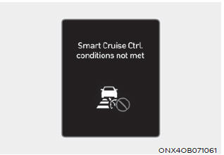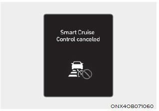 Если интеллектуальный круиз-контроль временно автоматически отменяется, функция «Smart Предупреждение об отключении круиз-контроля сообщение появляется в кластере, и раздается звуковой сигнал, чтобы предупредить Водитель.