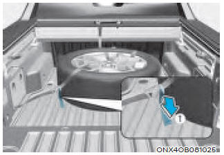 1. Выньте ремешок, который хранится в ящик для хранения под правым задним сиденье. Соедините две лямки с застегивайте, если это необходимо, перед использованием ремень для фиксации спущенной шины.