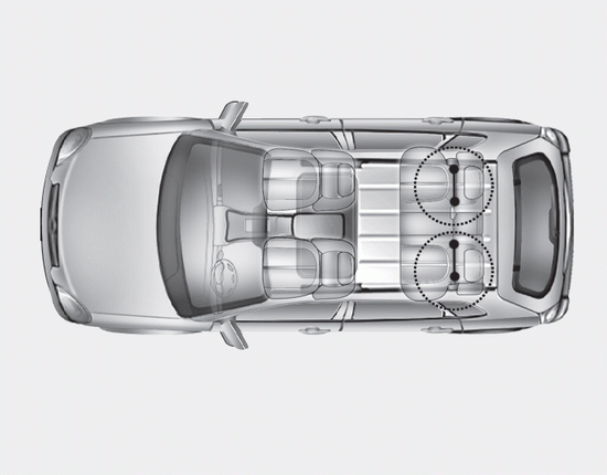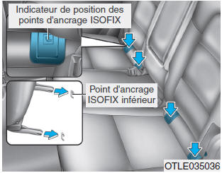 Два крайних задних сиденья оснащены двумя точками крепления ISOFIX. и соответствующее крепление верхнего троса, расположенное на спинках сидений. назад.