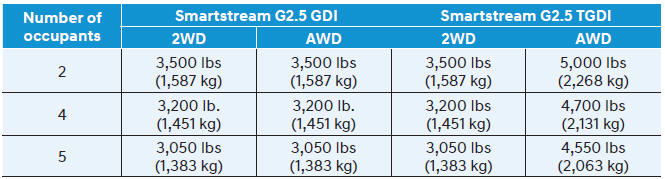 В таблице ниже указан максимальный вес прицепа для вашего типа автомобиля. на основе количество пассажиров автомобиля. Не превышайте максимально допустимый прицеп масса как показано. Максимальный вес прицепа включает вес прицепа, любой груз в прицеп и любое другое оборудование или предметы, прикрепленные к прицепу. буксировка загружает в превышение этого может серьезно повлиять на управляемость и производительность автомобиля и может повреждать двигатель и трансмиссия.