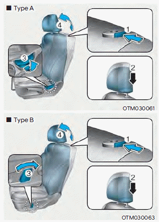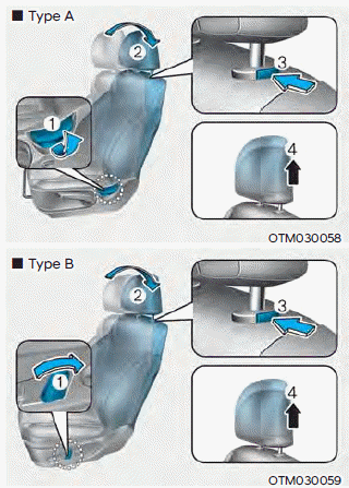 3. Нажмите кнопку разблокировки подголовника (3), потянув за подголовник. вверх (4).