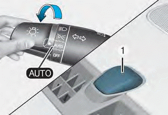Габаритный фонарь и фара автоматически включаются или выключаются в зависимости от от количества дневного света, измеренного датчиком внешней освещенности (1) в верхней край лобового стекла.