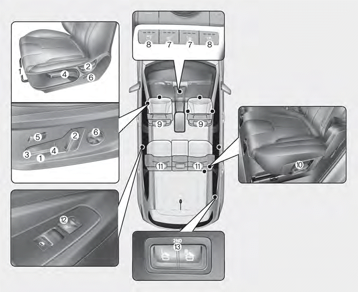 (13) Дистанционный переключатель складывания сидений 2-го ряда