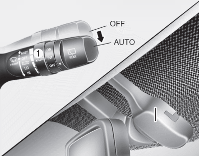 Чем больше идет дождь, тем быстрее работает дворник. Когда дождь прекращается, стеклоочиститель останавливается. Чтобы изменить настройку скорости, поверните ручку регулировки скорости (1). Если дворник переключатель установлен в режим AUTO, когда ключ зажигания находится в положении ON, дворники сработает один раз для выполнения самопроверки системы. Установите дворник в положение OFF когда стеклоочиститель не используется.