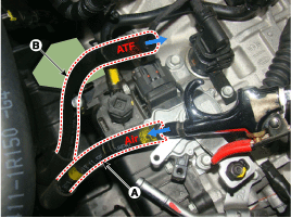 Отсоедините шланг (В) после снятия хомута (А) шланга охладителя жидкости автоматической коробки передач.